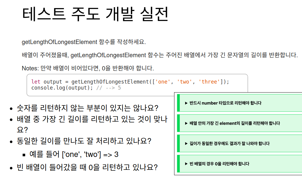 경우의 수를 하나씩 기대값과 실제값 비교한다.(유닛테스트. 개발방법론: 테스트 주도 개발)
