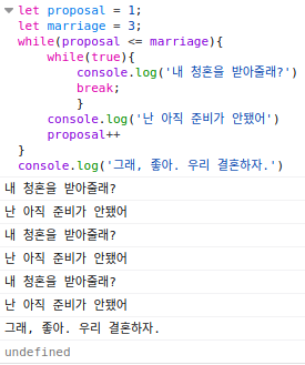 - 반복할 조건 중, 초기화, 증감문은 따로, 조건식만 괄호 안에 넣는다.
