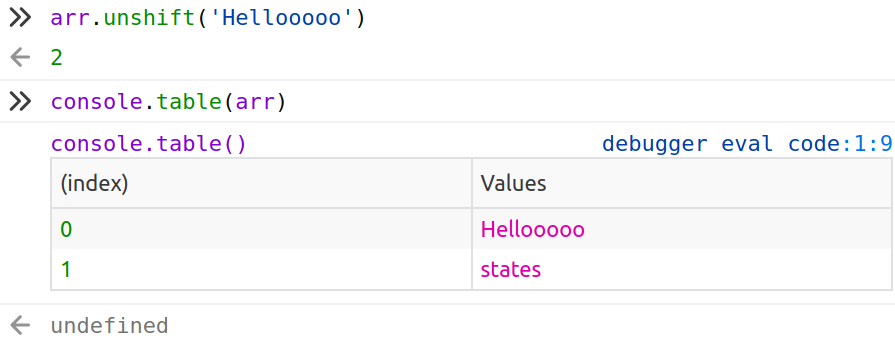 • Array.unshift(): 하나 이상의 요소를 배열의 가장 앞에 추가합니다.