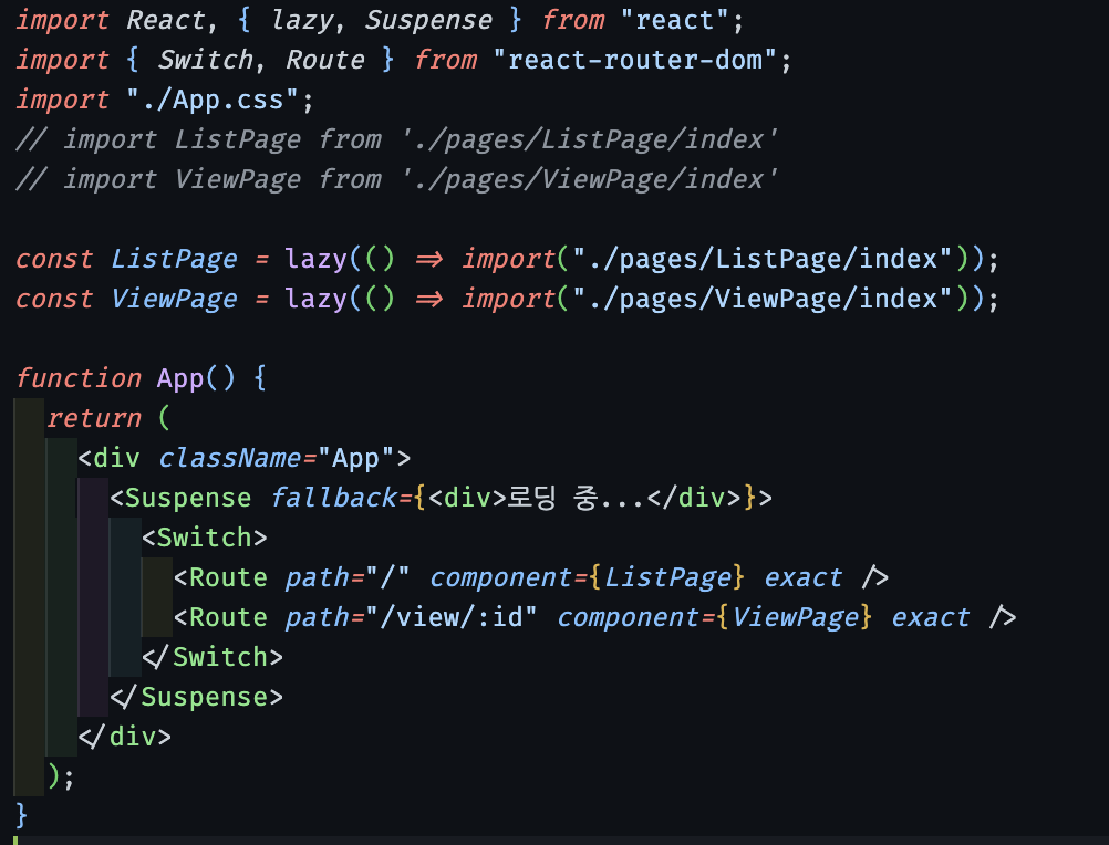 동적 import를 하는 동안 ListPage, ViewPage Component가 아직 값을 갖지 못할 때는 Suspense의 fallback prop에 정의된 내용으로 렌더링되고, 이후 Component 들이 온전히 로드됐을 때 fallback 값으로 렌더링된 Suspense가 정상적으로 ListPage, ViewPage Component 를 렌더링합니다.