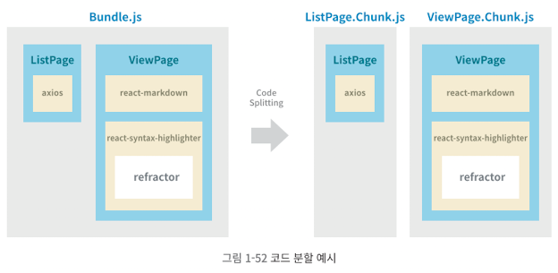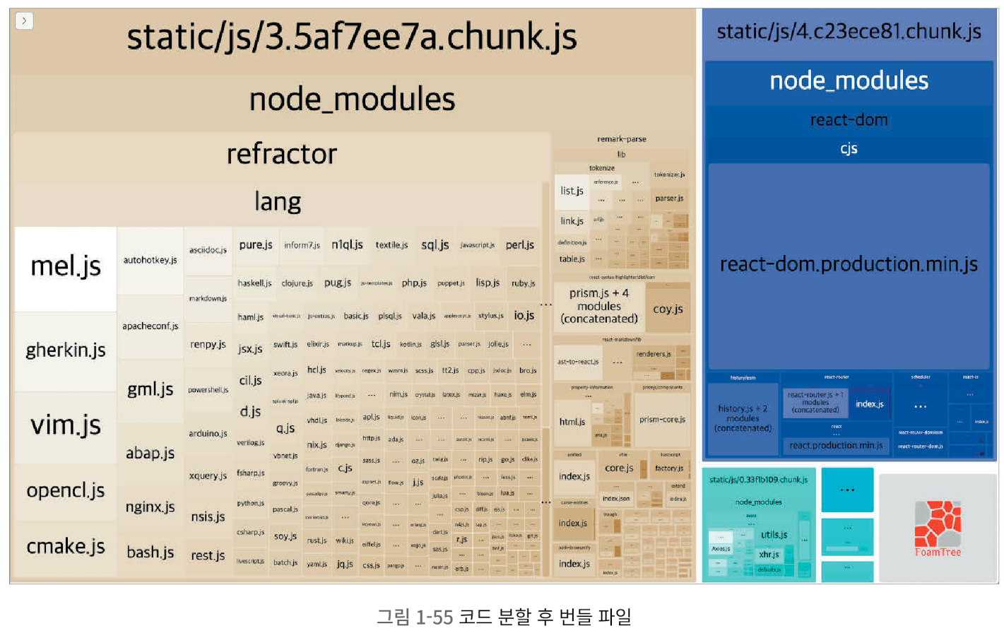 페이지별로 코드를 분할할 수도 있는 반면, 각 페이지가 공통으로 사용하는 모듈이 많고 그 사이즈가 큰 경우에는 페이지별로 분할하지 않고 그림 1-53의 오른쪽처럼 모듈별로 분할할 수도 있습니다.