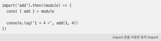 바로 동적 import 구문은 Promise 형태로 모듈을 반환해 준다는 것입니다.