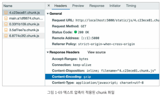 다시 실행한 후 살펴보면, 번들 파일의 사이즈가 줄어든 것과 응답 헤더에 Content-Encoding 값이 gzip으로 설정된 것을 볼 수 있습니다.