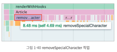 메인 스레드의 해당 구간을 따라 내려가다 보면 Article이라는 작업이 있습니다. 이름으로 추측해 보면 이 작업이 Article 컴포넌트를 렌더링하는 작업으로 보입니다. 그리고 그 아래로 하나 더 내려가 보면 removeSpecialCharacter라는 작업도 보입니다