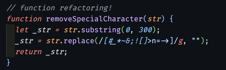 또한 사실 서비스에 사용되는 건 대략 200자 정도입니다. 그러면 굳이 9만 자나 되는 문자열을 모두 탐색 및 변경할 필요 없이 앞의 200자 정도만 잘라서 탐색하고 변경한다면 어떨까 생각해 볼 수 있습니다. 제거되는 문자까지 고려하여 300자로 자릅니다.