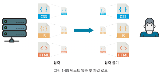 텍스트 압축이란 말 그대로 텍스트를 압축하는 것입니다. 기본적으로 HTML, CSS, 자바스크립트는 텍스트 기반의 파일이기 때문에 텍스트 압축 기법을 적용할 수 있습니다. 이런 파일을 압축하여 더 작은 크기로 빠르게 전송한 뒤, 사용하는 시점에 압축을 해제합니다. 이때 압축한 만큼 파일 사이즈가 작아질 테니 리소스를 전송하는 시간도 단축되는 것이죠.