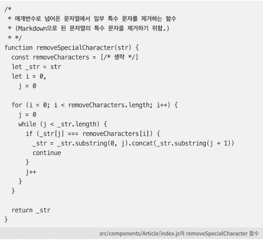 이 removeSpecialCharacter라는 작업이 Article 컴포넌트의 렌더링 시간을 길어지게 했다는 이야기인데 바로 src/Article/index.js에 있는 함수의 이름입니다.