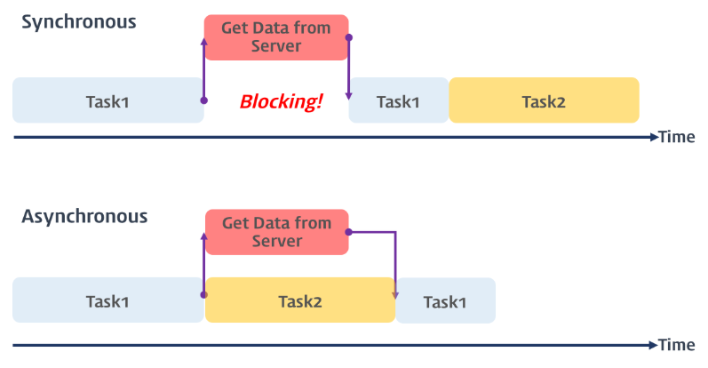 : 동기적인 처리방식. 특정 코드를 수행 완료한 후 아래줄의 코드를 수행한다.