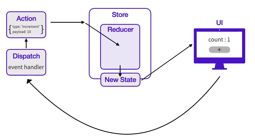 reducer 는 action 객체의 type 에 따라 동작을 선택하고, payload(변경된 데이터)를 활용하여 Store 를 업데이트 한다.