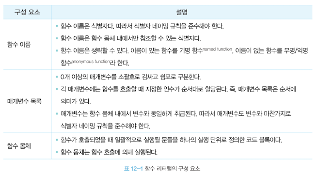 함수도 함수 *리터럴 로 생성할 수 있다. 함수 리터럴은 function 키워드, 함수 이름, 매개 변수 목록, 함수 몸체로 구성된다.