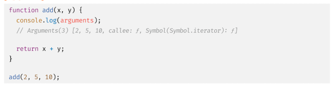 매개변수보다 인수가 더 많은 경우 초과된 인수는 무시된다. 사실 초과된 인수가 그냥 버려지는 것은 아니고, 모든 인수는 암묵적으로 arguments 객체의 프로퍼티로 보관된다.