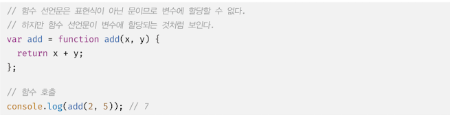 함수 선언문도 표현식이 아닌 문이므로 변수에 할당할 수 없다.
