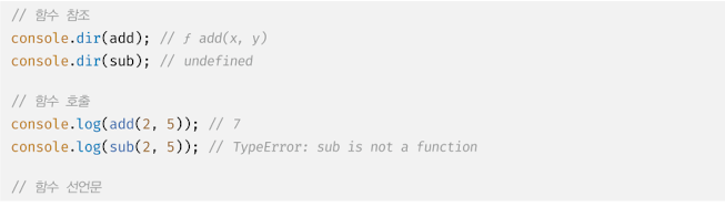 모든 선언문이 그렇듯 함수 선언문도 코드가 한 줄씩 순차적으로 실행되는 시점인 런타임(runtime) 이전에 자바스크립트 엔진에 의해 먼저 실행된다. 즉, 함수 선언문으로 함수를 정의하면 런타임 이전에 함수 객체가 먼저 생성된다. 그리고 자바스크립트 엔진은 함수 이름과 동일한 이름의 식별자를 암묵적으로 생성하고 생성된 함수 객체를 할당한다.