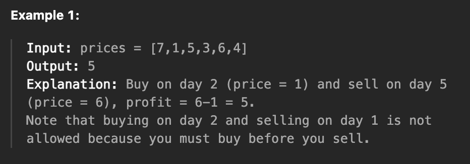 주식 가격 배열 prices가 주어질 때, 한 번의 매수와 매도로 얻을 수 있는 최대 이익을 구하는 문제이다.