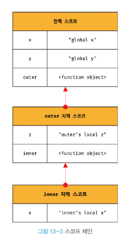inner 함수 내부에서 선언된 x 변수 이외에 이름이 같은 전역 변수 x 가 존재한다. 이때 inner 함수 내부에서 x 변수를 참조하면 전역 변수 x 를 참조하는 것이 아니라 inner 함수 내부에서 선언된 x 변수를 참조한다. 이는 자바스크립트 엔진이 스코프 체인을 통해 참조할 변수를 검색 했기 때문이다.