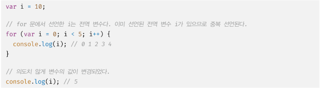 var 키워드로 선언된 변수는 블록 레벨 스코프를 인정하지 않기 때문에 i 변수는 전역 변수가 된다. 따라서 전역 변수 i는 중복 선언되고 그결과 의도치 않은 전역 변수의 값이 재할당된다.