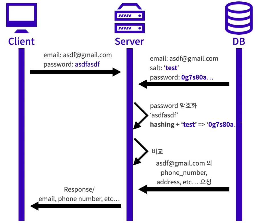 -> 요청 받은 비밀번호의 해싱값과 DB 에 저장되어 있는 해싱된 비밀번호의 대조