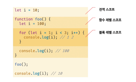 let 키워드로 선언한 변수는 모든 코드 블록(함수 ,if문, for문, while문, try/catch문 등) 을 지역 스코프로 인정하는 블록 레벨 스코프(block-level scope) 를 따른다.
