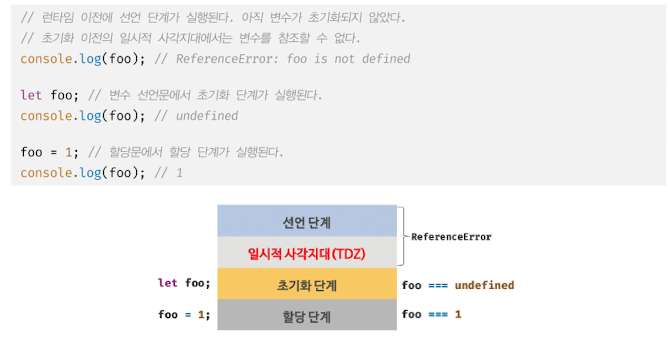 • let 키워드로 선언한 변수는 "선언 단계" 와 "초기화 단계" 가 분리되어 진행된다.