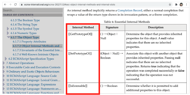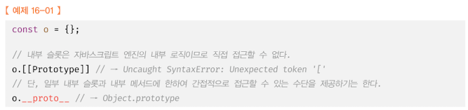 내부 슬롯과 내부 메서드는 자바스크립트 엔진의 내부 로직이므로 원칙적으로 자바스크립트는 내부 슬롯과 내부 메서드에 직접적으로 접근하거나 호출할 수 있는 방법을 제공하지 않는다. 단, 일부 내부 슬롯과 내부 메서드에 한하여 간접적으로 접근할 수 있는 수단을 제공한다.