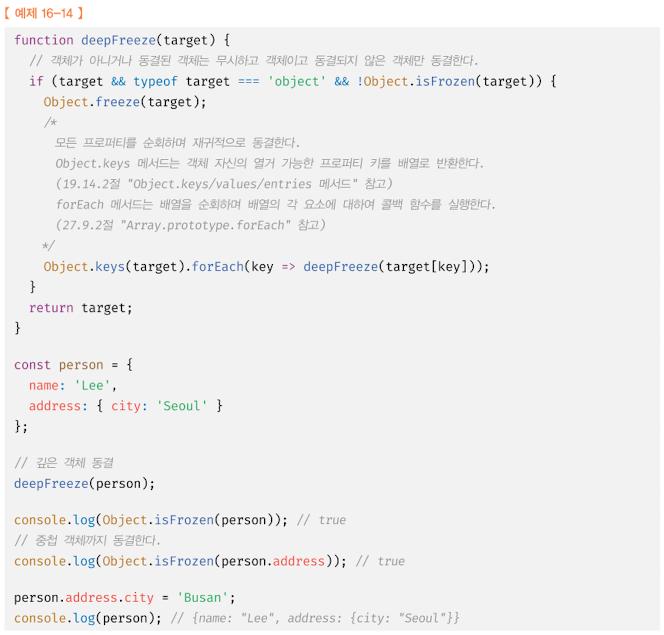예를 들어, 중첩 객체까지 동결하여 변경이 불가능한 읽기 전용의 불변 객체를 구현하려면 객체를 값으로 갖는 모든 프로퍼티에 대해 재귀적으로 Object.freeze 메서드를 호출해야 한다.