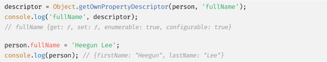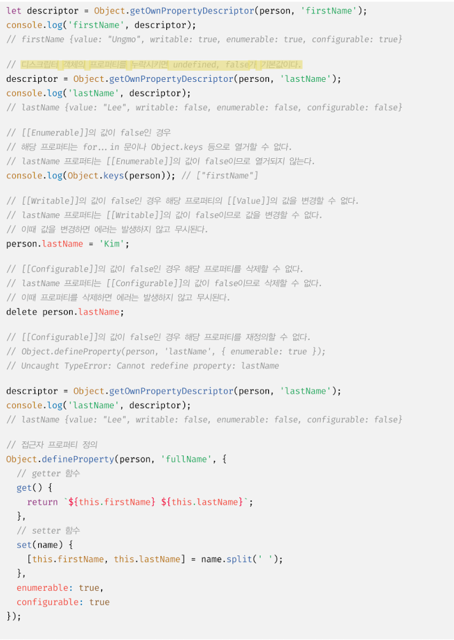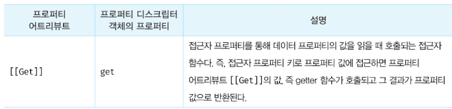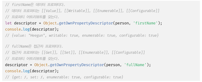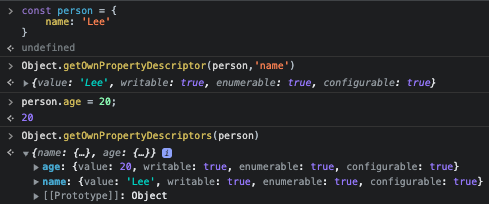 이다. 따라서 프로퍼티 어트리뷰트에 직접 접근할 수 없지만 Object.getOwnPropertyDescriptor 메서드를 사용하여 간접적으로 확인할 수 있다. Object.getOwnPropertyDescriptor 메서드는 프로퍼티 어트리뷰트 정보를 제공하는 프로퍼티 디스크립터(PropertyDescriptor) 객체를 반환한다. 존재하지 않는 프로퍼티나 상속받은 프로퍼티에 대한 프로퍼티 디스크립터를 요구하면 undefined 가 반환된다. Object.getOwnPropertyDescriptors 메서드는 모든 프로퍼티의 프로퍼티 어트리뷰트 정보를 제공하는 프로퍼티 디스크립터 객체들을 반환한다.