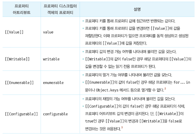 자바스크립트 엔진은 프로퍼티를 생성할 때 프로퍼티의 상태를 나타내는 프로퍼티 어트리뷰트를 기본값으로 자동 정의한다.