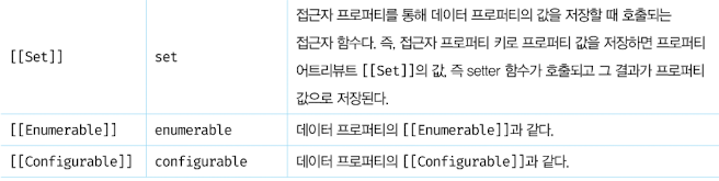 : 자체적으로는 값을 갖지 않고 다른 데이터 프로퍼티의 값을 읽거나 저장할 때 호출되는 접근자 함수(accessor function) 로 구성된 프로퍼티.