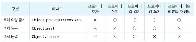 자바스크립트는 객체의 변경을 방지하는 다양한 메서드를 제공한다. 객체 변경 방지 메서드들은 객체의 변경을 금지하는 강도가 다르다.