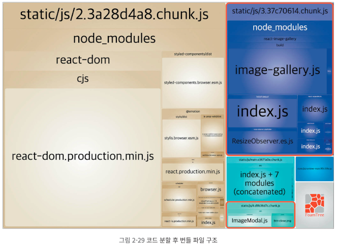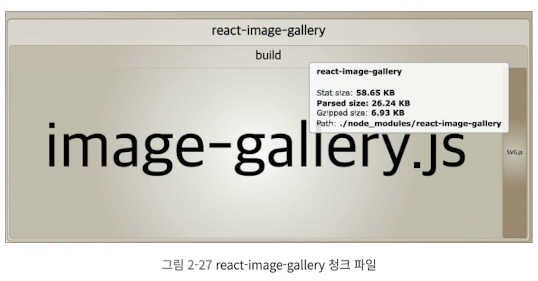 2.chunk.js의 내용을 보면, react-dom과 styled-components뿐만 아니라 react-image-gallery라는 라이브러리가 들어 있습니다. 그리고 이 라이브러리에 커서를 올려 두면 대략적인 사이즈가 26KB(Parsed size) 정도임을 알 수 있는데(그림 2-27), 사실 이 라이브러리는 서비스 첫 화면부터 필요하지 않습니다. 이 라이브러리가 필요한 시점은 사진 갤러리가 있는 모달 창을 띄울 때입니다.