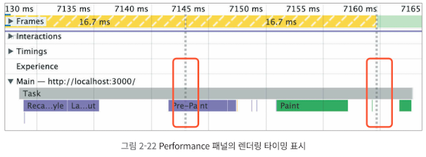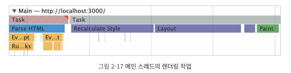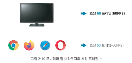 앞서 브라우저는 1초에 화면을 최대 60번 그린다고 했는데요. 화면을 그리는 시점이 바로 그림 2-18에서 점선으로 된 시점입니다.