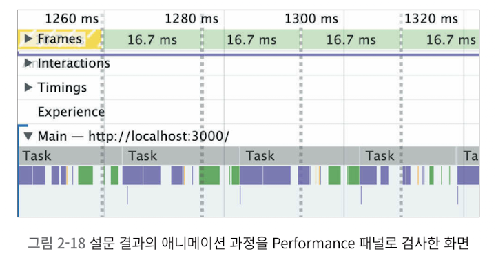 그렇다면 올림픽 통계 서비스의 막대 그래프 애니메이션에서 쟁크 현상이 발생한 이유도 브라우저가 정상적으로 60FPS로 화면을 그리지 못했기 때문이라고 유추해 볼 수 있습니다.