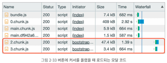 오른쪽 Waterfall에서 타임라인을 확인해 보면 초기 페이지 로드에 필요한 파일(0.chunk.js, bundle.js)을 우선 다운로드하고 페이지 로드가 완료된 후에야 모달 코드를 다운로드하고 있습니다.