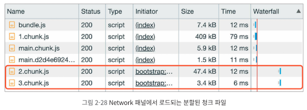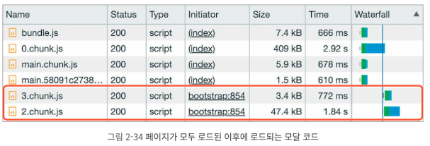 오른쪽 Waterfall에서 타임라인을 확인해 보면 초기 페이지 로드에 필요한 파일(0.chunk.js, bundle.js)을 우선 다운로드하고 페이지 로드가 완료된 후에야 모달 코드를 다운로드하고 있습니다.