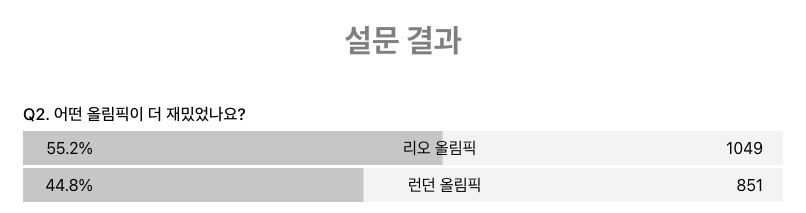 설문 항목을 클릭하면 해당 응답에 대해 필터링되고 막대 그래프의 배경 색과 막대의 가로 길이가 변합니다.