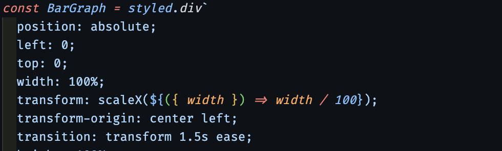 여기서 주의할 점은 단순히 transform에 scaleX 값만 설정하면 막대 너비가 비율대로 표시되긴 하는데, 왼쪽에 치우치지 않고 가운데 정렬이 되어 버립니다. 그 이유는 기본적인 scale의 기준점이 중앙에 있기 때문에 중앙을 중심으로 정렬된 것인데요. 이것을 왼쪽 기준으로 변경하기 위해서 transform-orgin 속성을 center left로 변경해 줘야 합니다.