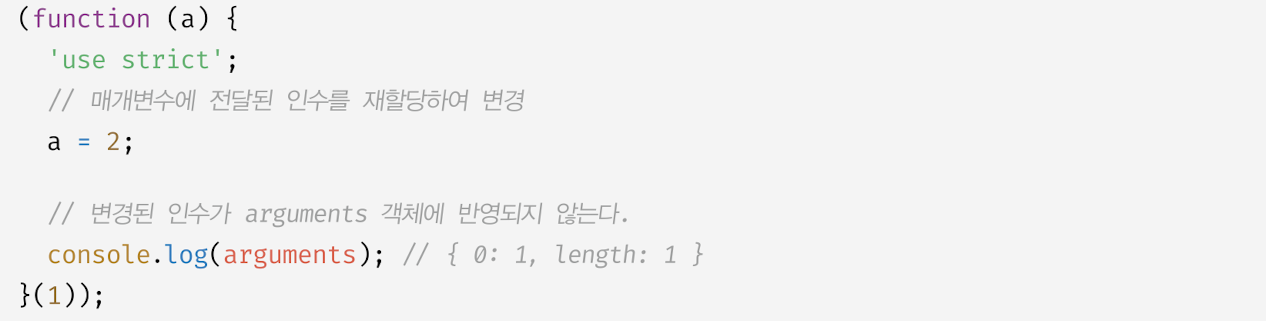 매개변수에 전달된 인수를 재할당하여 변경해도 arguments 객체에 반영되지 않는다.