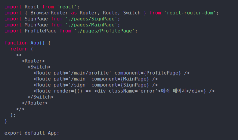 경로가 / 인 라우트가 맨 상위에 있을 경우 어떤 페이지로 이동하던 결과는 Signpage 일 것. 따라서 맨 마지막에 위치시켜준다.