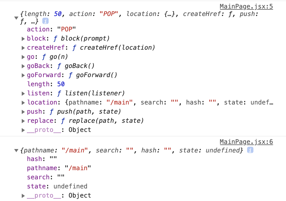 두 번째 콘솔은 location이며 각각 프로퍼티 별로 값이 있습니다. 현재는 /main에 접근해 있기 때문에 해당 pathname을 가진 상태입니다.