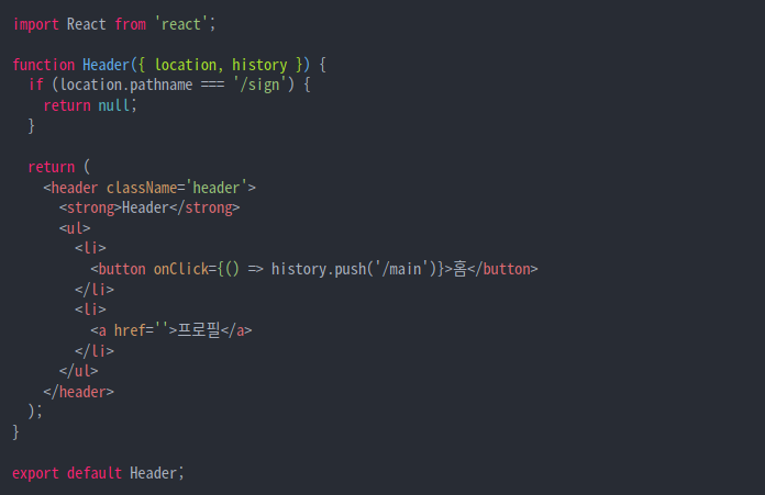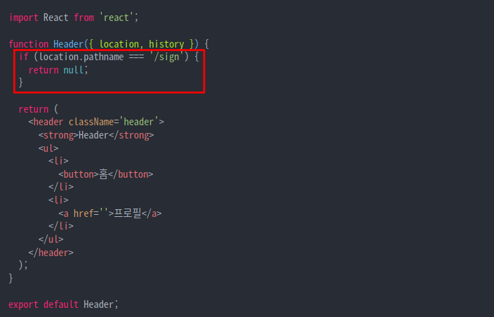 즉, /sign으로 접근을 해 있다면 로그인 페이지만 보여줄 수 있도록 헤더가 사라지는 예외처리(return null)를 구현한 것입니다.