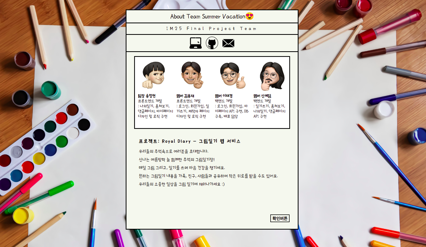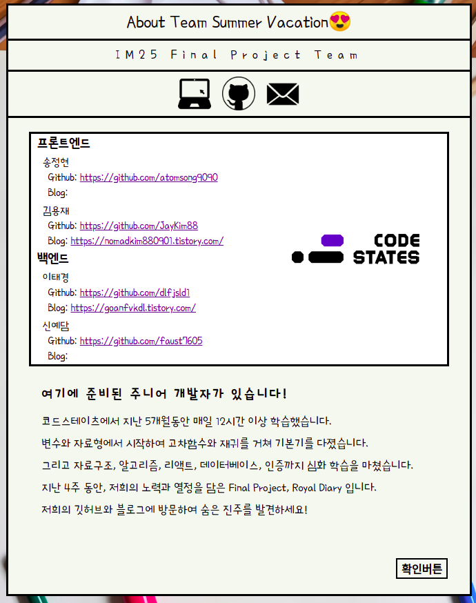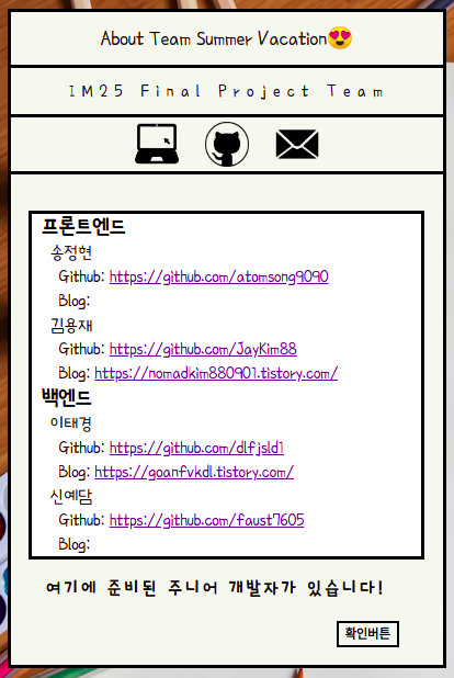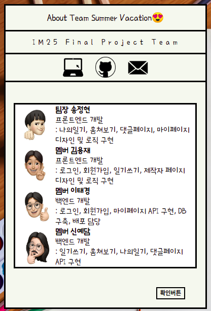 개발자 소개페이지를 완성했는데, 팀원 소개는 캐릭터를 적용했다.