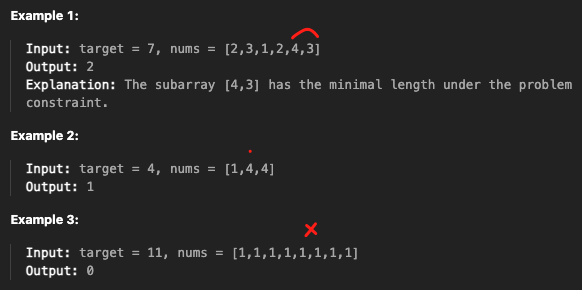 양의 정수 배열 nums와 정수 target이 주어질 때, 연속된 부분 배열(subarray)의 합이 target 이상이 되는 가장 짧은 길이를 구하는 문제다. 만약 조건을 만족하는 부분 배열이 없다면 0을 반환한다.