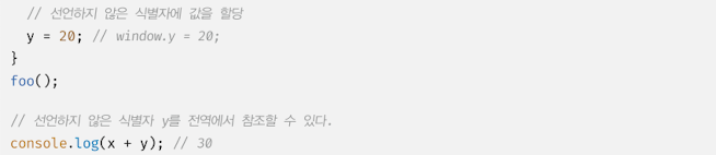 하지만 선언하지 않은 식별자 y는 마치 선언된 전역 변수처럼 동작한다.