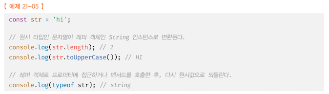 즉, 원시값을 객체처럼 사용하면 자바스크립트 엔진은 암묵적으로 연관된 객체를 생성하여 생성된 객체로 프로퍼티에 접근하거나 메서드를 호출하고 다시 원시값으로 되돌린다. 이처럼 문자열, 숫자, 불리언 값에 대해 객체처럼 접근하면 생성되는 임시 객체를 래퍼 객체_wrapper object 라 한다.