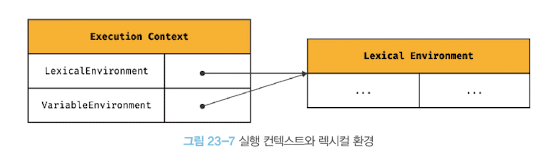식별자와 스코프는 실행 컨텍스트의 렉시컬 환경으로 관리하고 코드 실행 순서는 실행 컨텍스트 스택으로 관리한다.