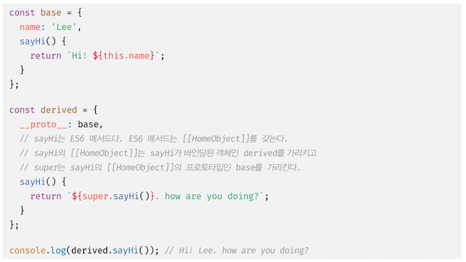 super 참조는 내부 슬롯 [[HomeObject]]를 사용하여 수퍼클래스의 메서드를 참조하므로 내부 슬롯 [[HomeObject]]를 갖는 ES6 메서드는 super 키워드를 사용할 수 있다.