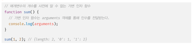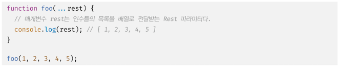 ES6에서는 rest 파라미터를 사용하여 가변 인자 함수의 인수 목록을 배열로 직접 전달받을 수 있다. 이를 통해 유사 배열 객체인 arguments 객체를 배열로 변환하는 번거로움을 피할 수 있다.
