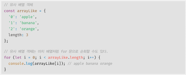 유사 배열 객체_array-like object 는 마치 배열처럼 인덱스로 프로퍼티 값에 접근할 수 있고 length 프로퍼티를 갖는 객체를 말한다. 유사 배열 객체는 마치 배열처럼 for 문으로 순회할 수도 있다.