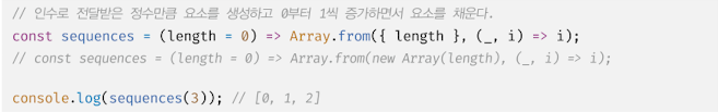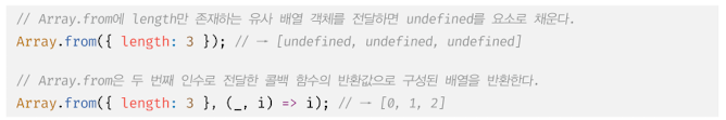 하지만 Array.from 메서드를 사용하면 두 번째 인수로 전달한 콜백 함수를 통해 요소값을 만들면서 배열을 채울 수 있다. Array.from 메서드는 두 번째 인수로 전달한 콜백 함수에 첫 번째 인수에 의해 생성된 배열의 요소값과 인덱스를 순차적으로 전달하면서 호출하고, 콜백 함수의 반환값으로 구성된 배열을 반환한다.