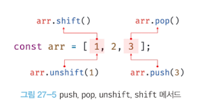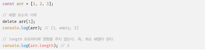delete 연산자는 객체의 프로퍼티를 삭제한다. 따라서 위 예제의 delete arr[1]은 arr에서 프로퍼티 키가 '1' 인 프로퍼티를 삭제한다. 이때 배열은 희소 배열이 되며 length 프로퍼티 값은 변하지 않는다. 따라서 희소 배열을 만드는 delete 연산자는 사용하지 않는 것이 좋다.